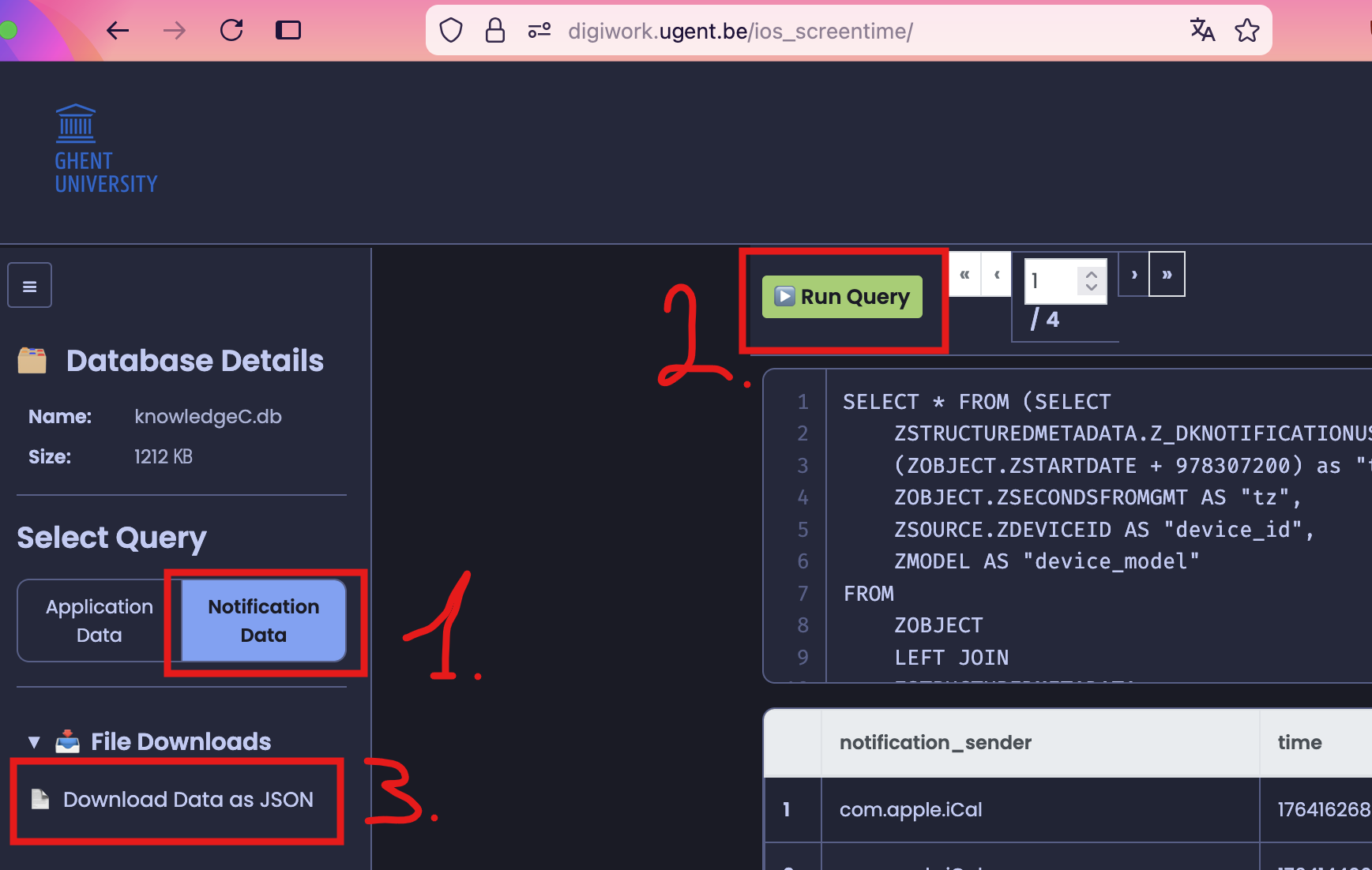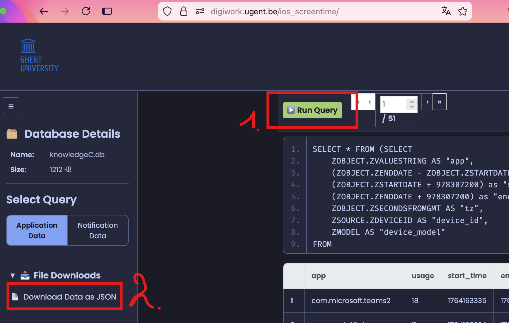 KnowledgeC.db-bestand. - Kies links bij “Select Query” de optie Application Data en klik op Run Query.